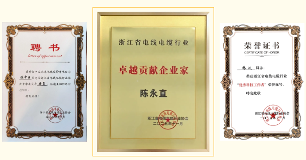 为树立标杆,激励先进,大会同期还隆重举行了“卓越贡献企业家、新生代领军人物、优秀科技工作者、优秀工匠、优秀供应商”表彰活动,并向协会“专家委员会”委员颁发聘书。公司凭借在行业内的深厚积淀与突出贡献,斩获多项荣誉:公司总经理陈永直以在线缆行业的影响力和突出贡献,荣获“卓越贡献企业家”称号;副总工程师陈中区被聘任为浙江省电线电缆行业协会专家委员会委员;高压技术部部长林波依托在线缆技术研发的突出成果,获评“优秀科技工作者”。现场掌声雷动,气氛热烈,充分展现了浙江线缆行业团结一心、奋发有为的精神风貌。
