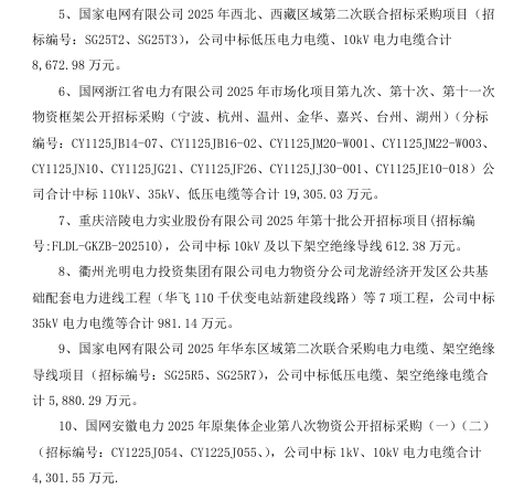 项目类型丰富多元,既涵盖城市配网升级项目,也包含新能源基地并网配套工程,同时还涉及川藏联网工程、粤港澳大湾区电网升级等国家级重点项目,充分契合当前电网建设的多维度需求,也标志着球冠电缆已突破传统华东市场局限。其中华北区域项目中标金额最高达2.22亿元,浙江区域市场化项目合计中标1.93亿元。此次重大项目的中标,将对公司未来经营业绩产生显著积极影响。