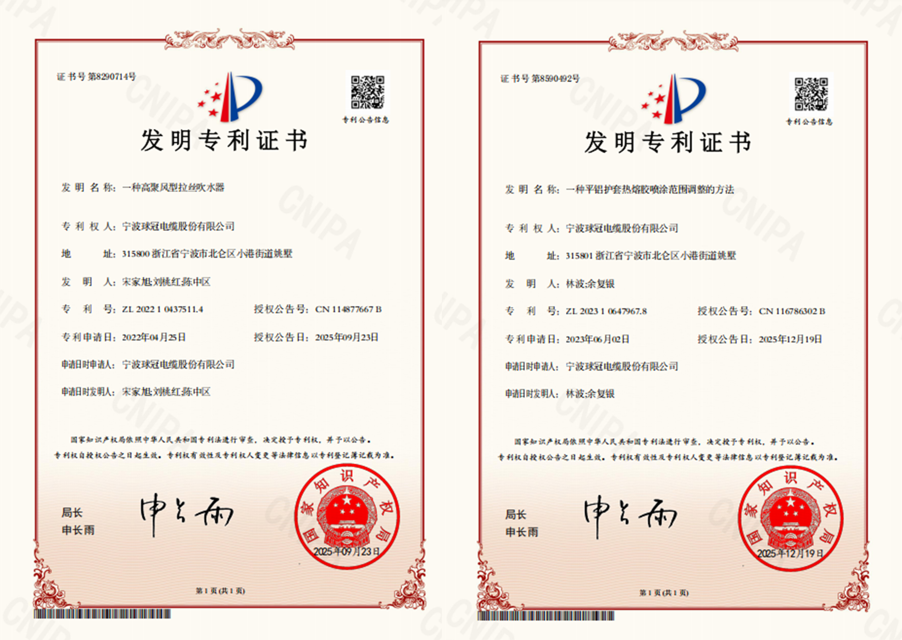 2025年度,球冠电缆在技术创新领域再创佳绩,全年累计获得专利授权17项,其中发明专利2项、实用新型专利15项,年度授权数量创下历史新高。这些成果不仅充分展现了公司在研发领域的深厚积淀与技术实力,更进一步巩固了其在电线电缆制造行业中的技术引领地位。