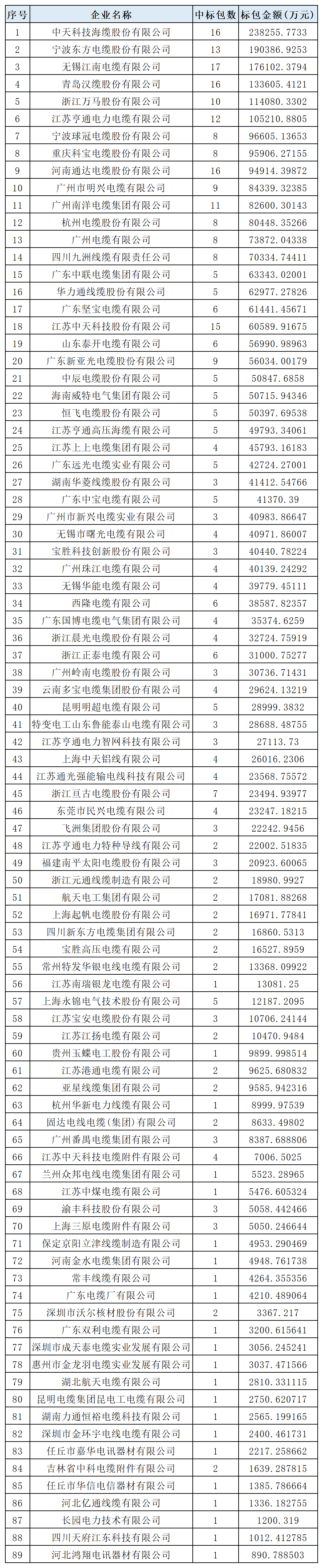 其中,中标前二十名的企业为:中天科技海缆股份有限公司、宁波东方电缆股份有限公司、无锡江南电缆有限公司、青岛汉缆股份有限公司、浙江万马股份有限公司、江苏亨通电力电缆有限公司、宁波球冠电缆股份有限公司、重庆科宝电缆股份有限公司、河南通达电缆股份有限公司、广州市明兴电缆有限公司、广州南洋电缆集团有限公司、杭州电缆股份有限公司、广州电缆有限公司、四川九洲线缆有限责任公司、广东中联电缆集团有限公司、华力通线缆股份有限公司、广东坚宝电缆有限公司、江苏中天科技股份有限公司、山东泰开电缆有限公司、广东新亚光电缆股份有限公司,更多中标企业见榜单。除上述企业外,还有众多线缆企业在2025年度南方电网总部线缆物资招标采购中同样取得了优异的成绩。这些企业共同构筑了我国线缆行业多元化、高竞争力的生态体系,此份名单不仅记录了线缆企业在2025年度中标的辉煌成绩,也见证了我国线缆行业在技术创新和市场拓展方面所取得的显著进步。