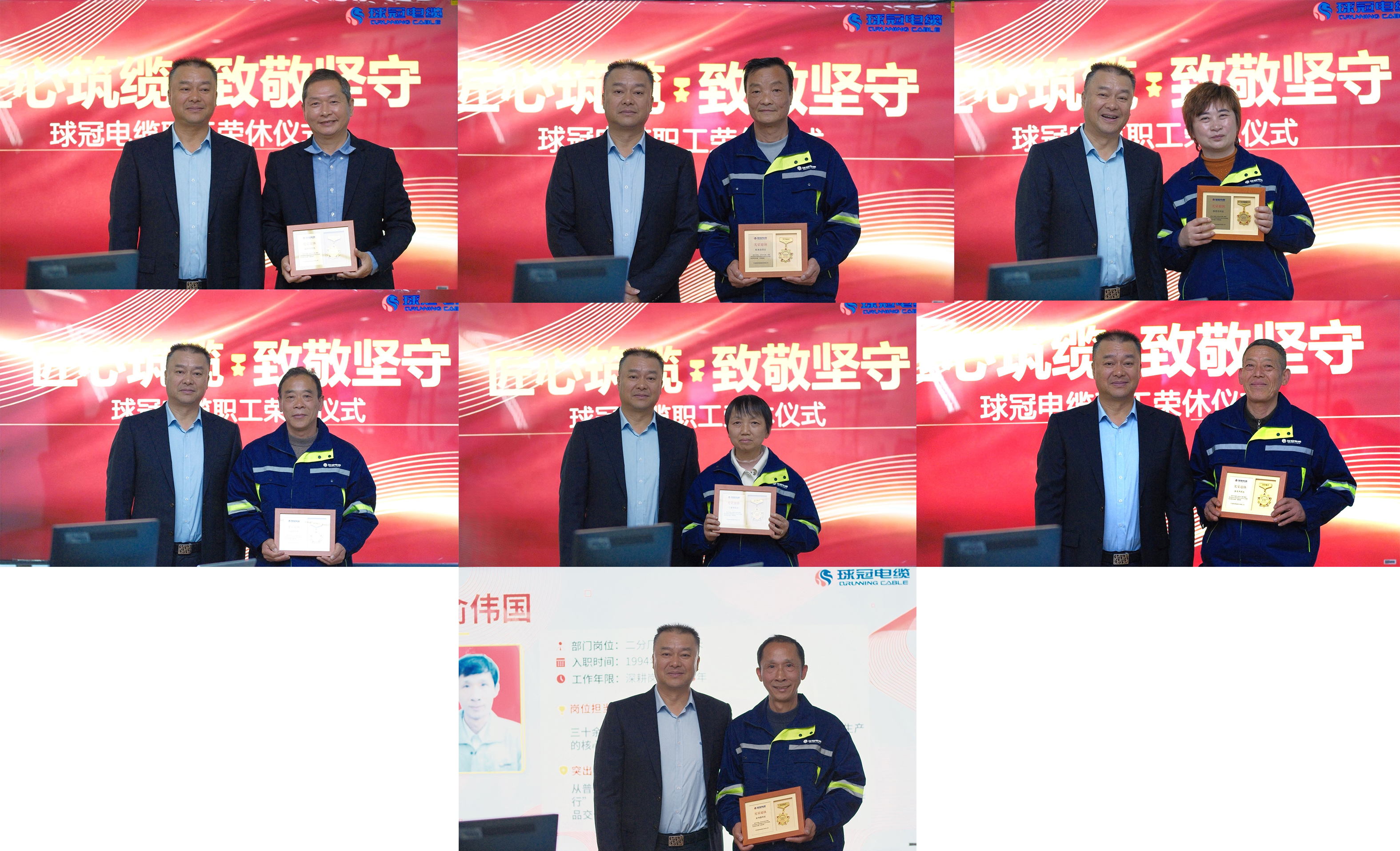 岁月映初心,荣光致芳华。为致敬退休员工的坚守与付出,传递企业的感恩与关怀,3月25日上午,球冠电缆2026年第一期职工荣休仪式在公司一楼大会议室温情启幕。总经理及高层领导出席仪式,与7名工龄15年以上、将于4月底前光荣退休的员工共同见证这一温馨时刻,仪式简洁庄重,全程洋溢着感恩与不舍的浓厚氛围。